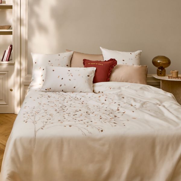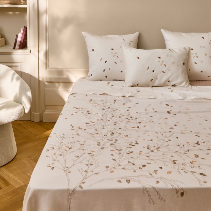 EQUINOXE II ir modernas elegances kolekcija, kas radusies no delikātas harmonijas starp gaismu un ēnu, starp dabiskumu un modernitāti. Audums ir grezns kokvilnas satīns, kam raksturīga mīksta tekstūra un smalks spīdums, dekorēts ar krītošu lapu motīviem un izšūtiem spalvām. Šīs kolekcijas maigās krāsas rada mierīgu, no dabas iedvesmotu atmosfēru un perfekti saderas gan ar minimālisma, gan klasiskā stila interjeru.Audums ir gluds, blīvs 120 pavedieni/cm² elpojošs un viegli kopjams. Palutiniet sevi ar relaksāciju, kas izskatās tikpat labi, cik labi jūtas!